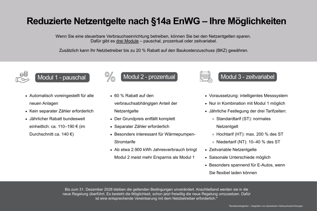 Die Reduzierung der Netzentgelte nach §14a kann auf drei unterschiedliche Arten erfolgen, die als Modul 1, 2 und 3 bezeichnet werden.